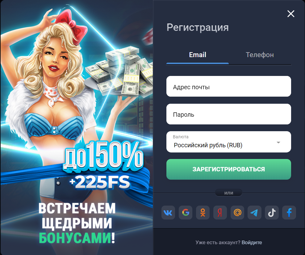 - нажмите внизу на «регистрация» и выберете любой способ;
